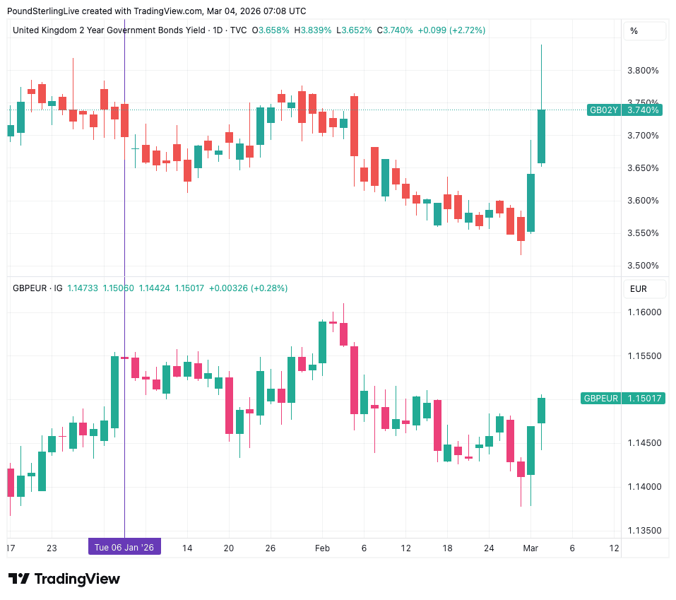 The two-year gilt yield, which closely tracks expectations for central bank policy, surged to 3.74% after rising sharply over the previous two sessions. GBP/EUR tracked the move to go back above 1.15.