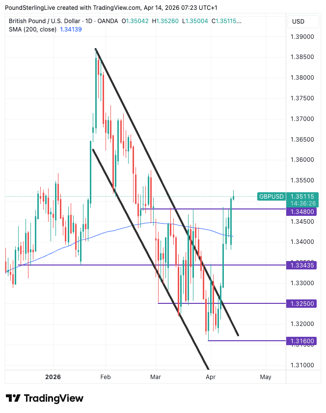 GBP/USD recorded its sixth consecutive daily gain on Monday and rose to 1.3508, making for a bottom-to-top move of nearly one per cent, a sizeable recovery for a pair that started the week deep in the red on fears the U.S. blockade of the Strait of Hormuz represented a negative development. The rise in spot takes competitive 0%-fee transfer provider rates to 1.3470 while high street bank transfer rates are in the region of 1.3157.