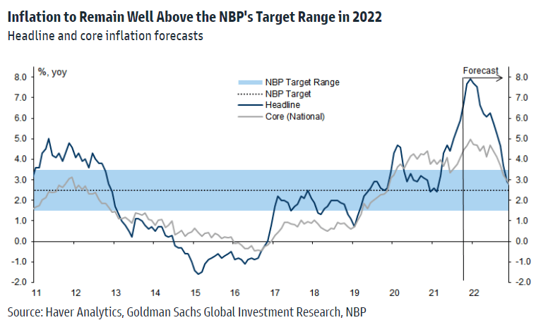“The relentless increase in inflation continues to put pressure on the NBP, and we now see risks that the Council may hike by more than our baseline forecast of 50bp at next week's MPC meeting,” says Kevin Daly, co-head of CEEMEA economics at Goldman Sachs.