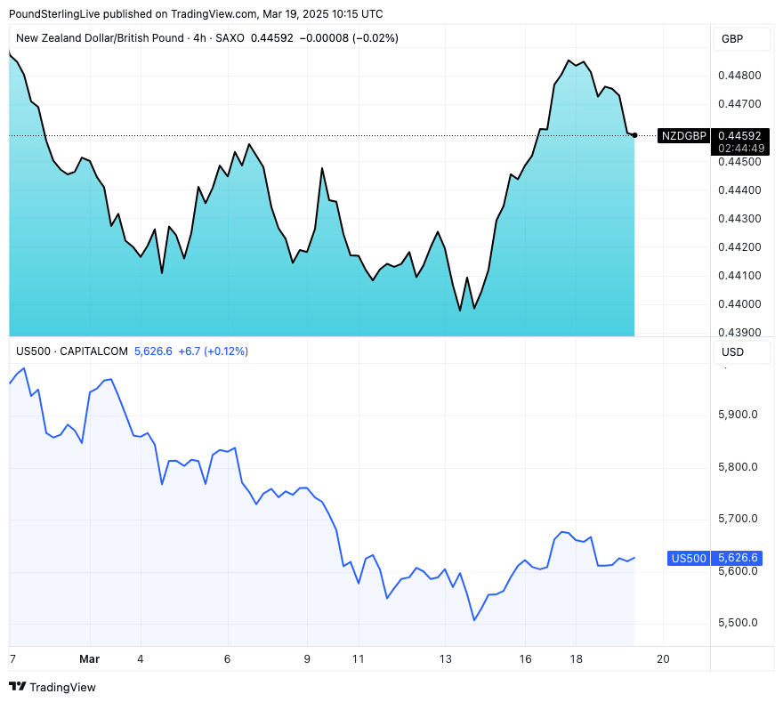 Above: NZD vs. GBP rises as the U.S. S&P 500 recovers (lower panel).