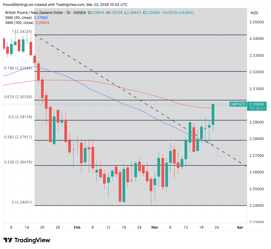 Gains take GBP/NZD above the 50-day moving average (MA) and into the 100-day, confirming a shift in short-term direction.
