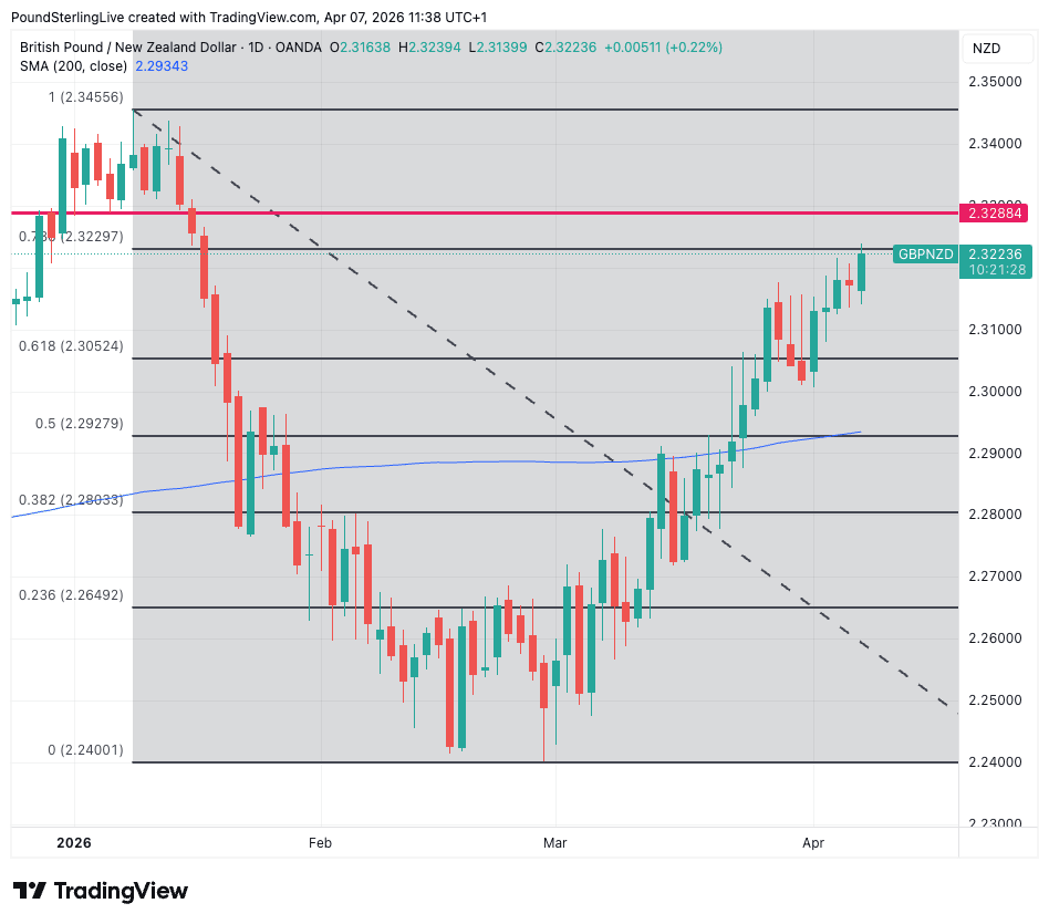 GBP/NZD rises to 2.3229 this Tuesday, marking an important point in its 2026 journey: it has recouped 78.6% of the year's loss.
