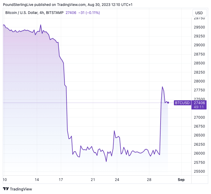 The price of Bitcoin (BTC) rose by 6.22% on the news to $27726/btc.