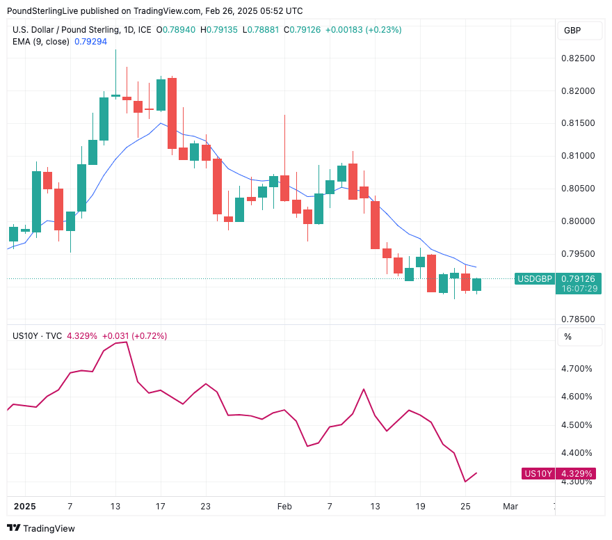Above: USD/GBP tracks the U.S. ten-year bond yield lower.