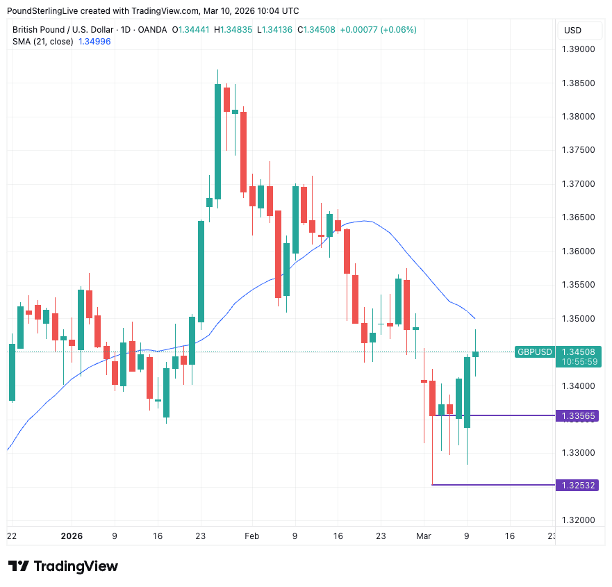 GBP/USD has recovered to 1.3466 on Tuesday as the U.S. dollar retreats alongside a pullback in energy prices.