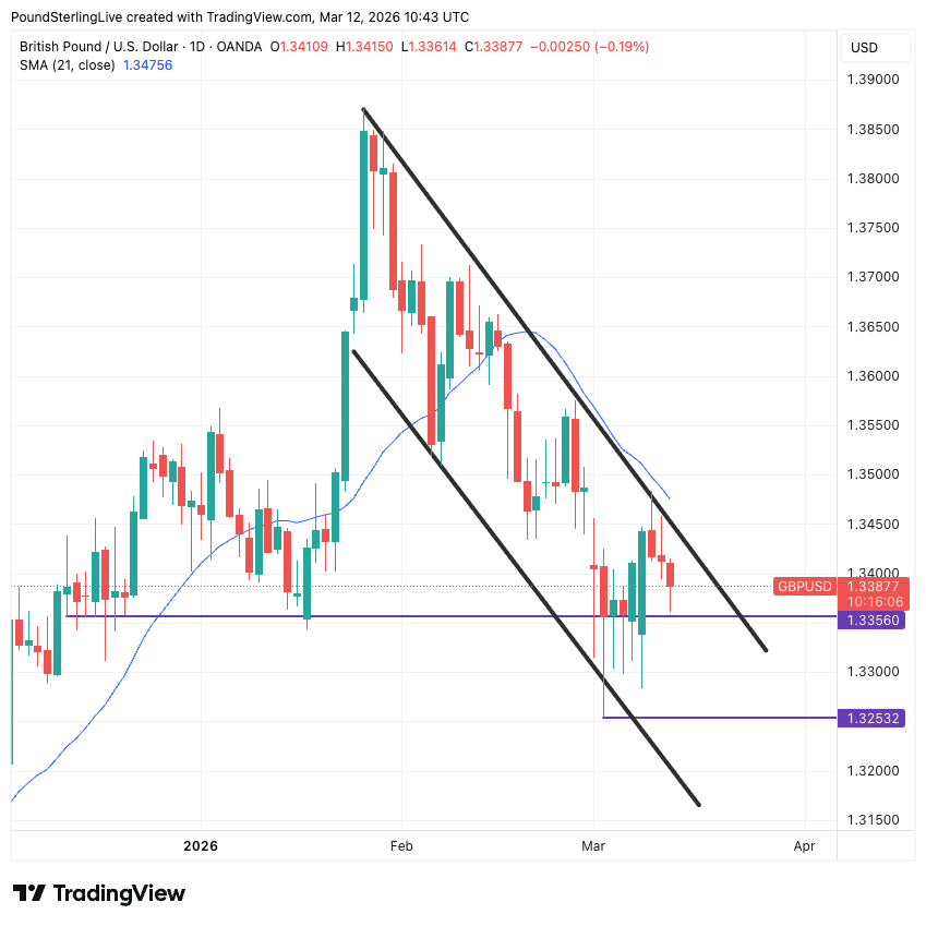 The pound is softer against the dollar through midweek and into Thursday, confirming a broader short-term downtrend is intact.