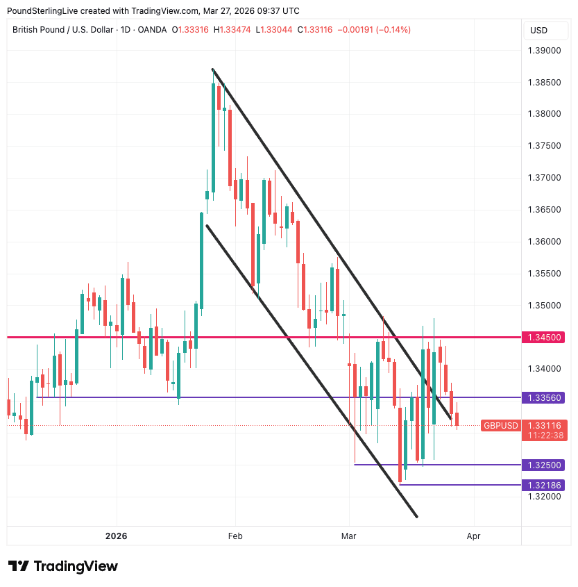 The pound-dollar exchange rate is down for a fourth consecutive day at 1.3311 as markets get used to a drawn-out period of uncertainty over the Iran war.