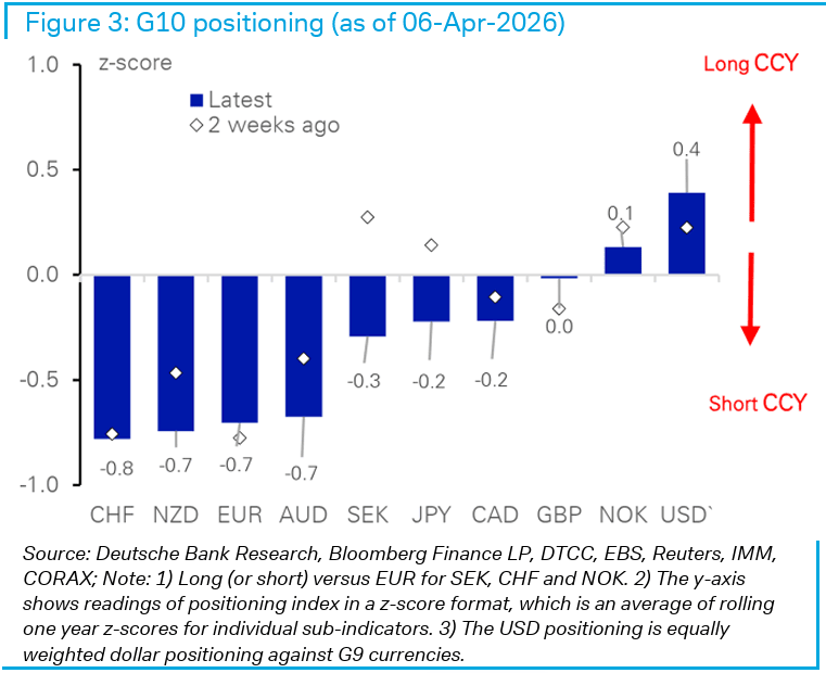 Recent G10 positioning data from Deutsche Bank shows the dollar is by far the biggest 'long', with the Swiss franc the biggest short.