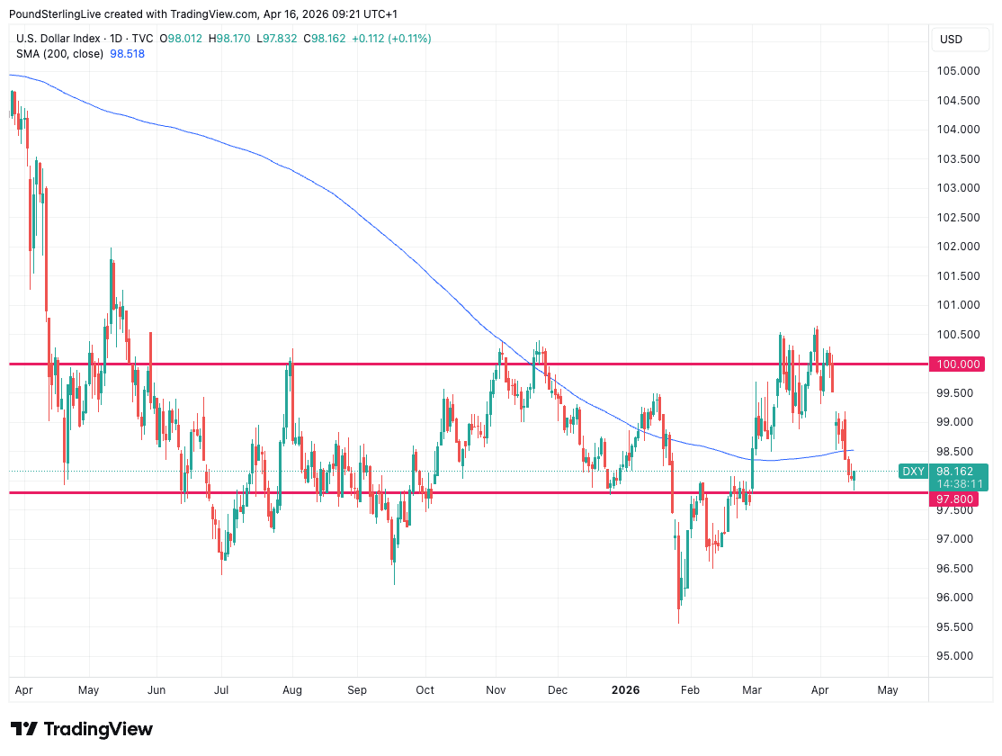 The net result is a dollar index, which is a broader measure of USD performance, meeting support in the run-up to 97.80. The area between 97.80 and 100 is the locus of the majority of dollar trade since April 2025.