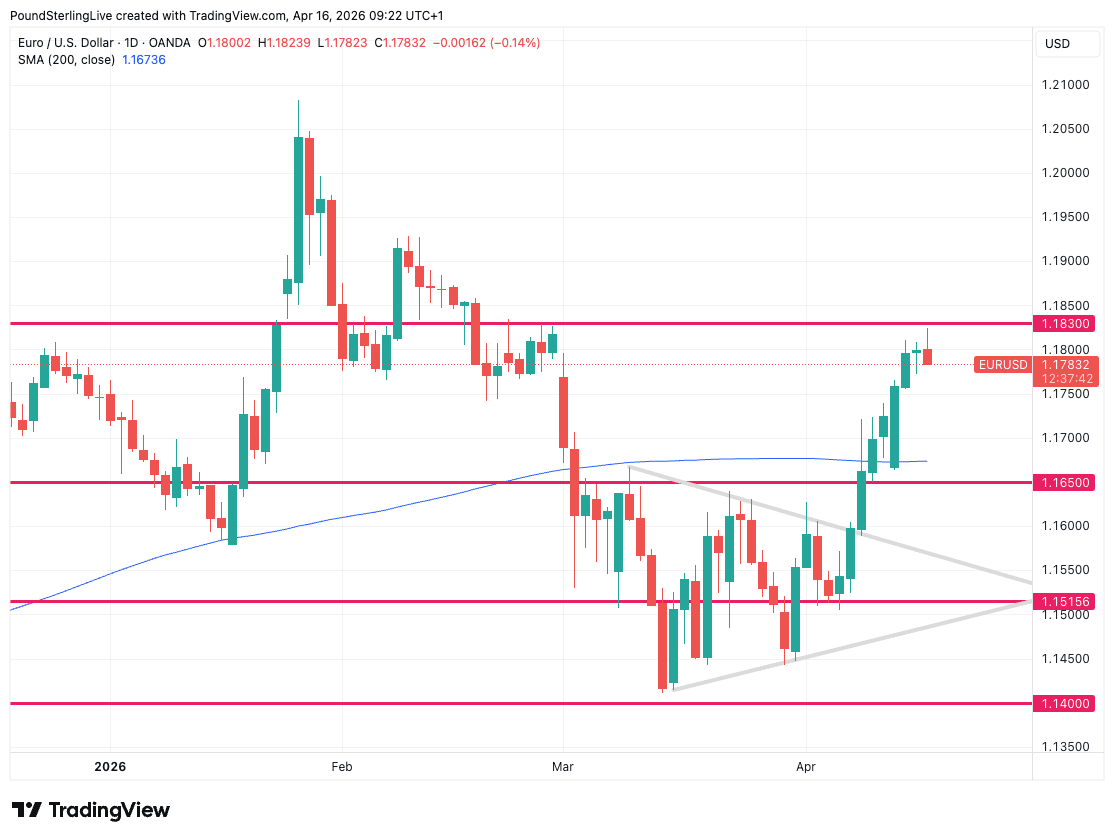 This coincides with EUR/USD stalling on rises to 1.1830, where it meets its own resistance.