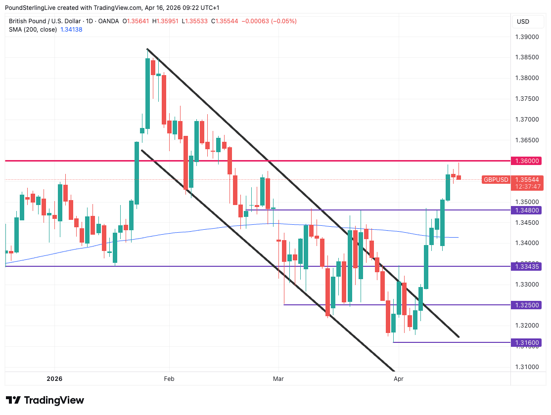 GBP/USD rose to 1.36 on Thursday, but has turned lower, making this the third successive attempt to breach the level, confirming the existence of a graphical horizontal resistance area here: