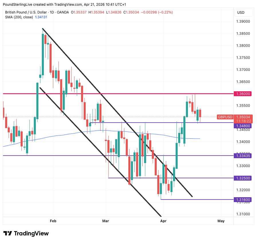 Pound-dollar retreated to interim support at 1.3480 on Monday and Tuesday and on both occasions found solid buying interest that keeps it afloat in the 1.3480-1.36 range.