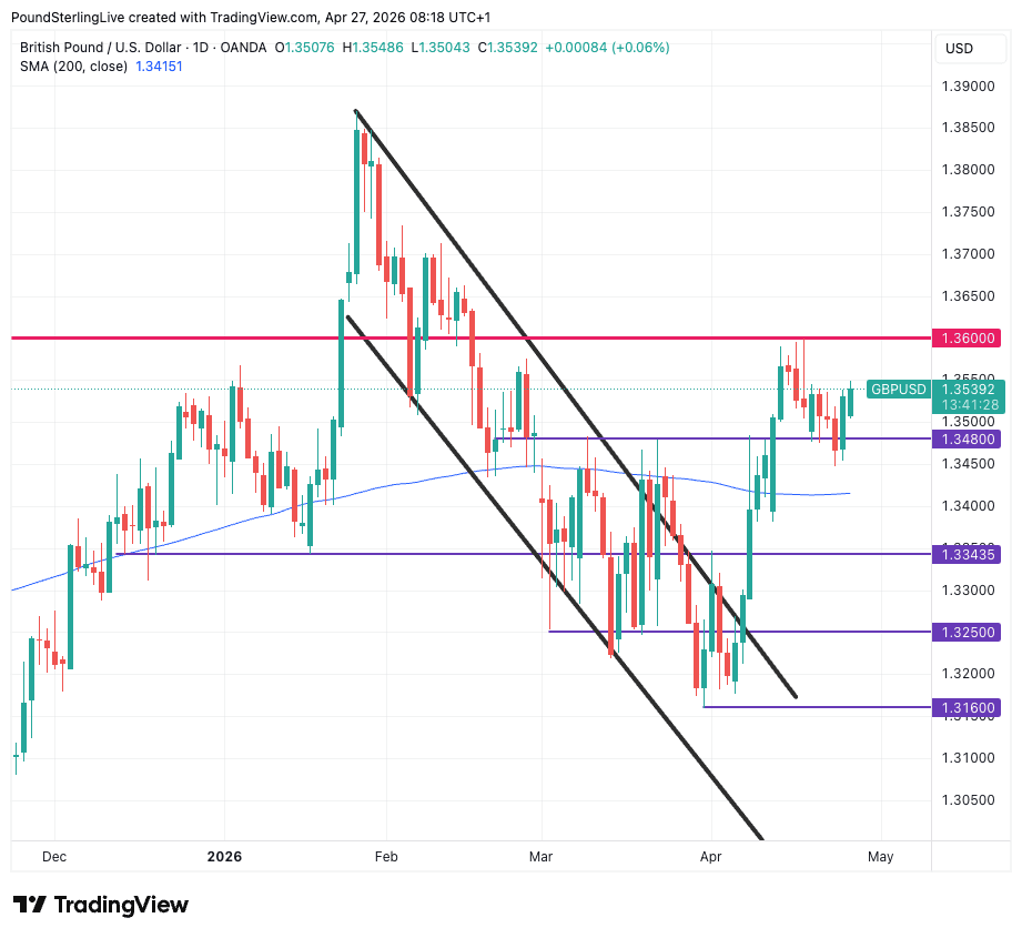 The pound-dollar exchange rate has been consolidating between 1.36 and 1.3480 for about ten days now, having rallied from lows at 1.3160 earlier in April.
