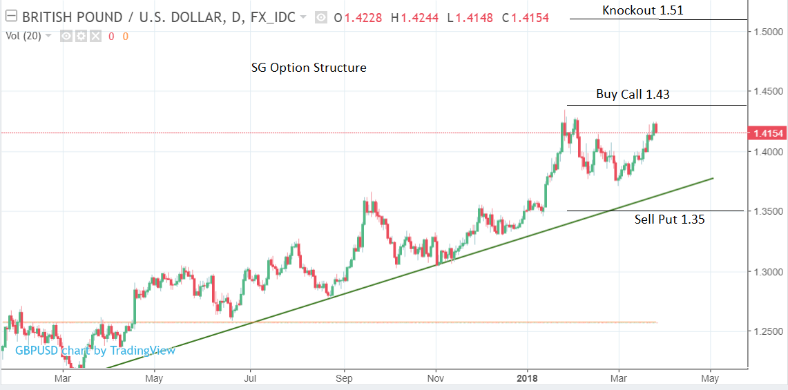 The option will make money if it simply rises from its current level above 1.4300 and higher but does not reach as high as 1.5100, which is a 'knockout' level, meaning that if the exchange rate touches it the option will expire worthless.