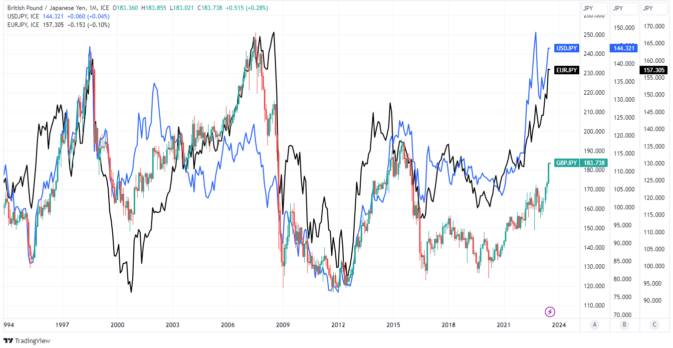 Above: GBP/JPY shown at monthly intervals alongside EUR/JPY and USD/JPY.