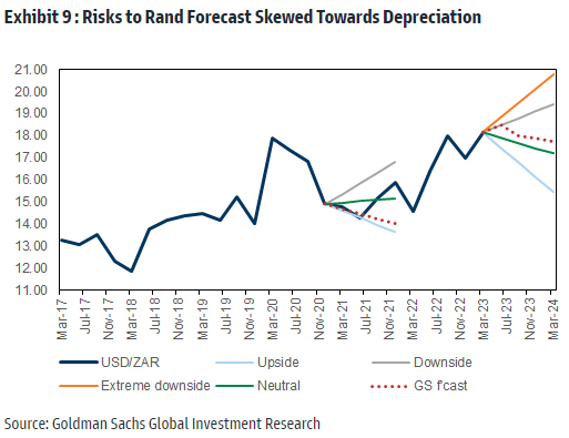 Goldman Sachs forecasts look for USD/ZAR to edge higher to 18.50 in three months before falling to 17.75 over 12 months, while GBP/ZAR is seen falling to 21.25 in three before edging back up to 21.63 over the coming year.